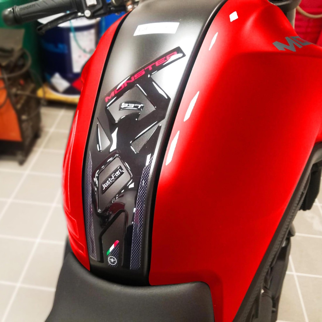 Resin adhesive tank protector for Ducati Monster 937 2021 motorbike tank. 3D resin gel sticker Exclusive - Labelbike®. Adhesive tank protector MADE IN ITALY made in resin with 3D effect. Graphics with Black and Carbon Look base (carbon effect) and red lettering Monster.