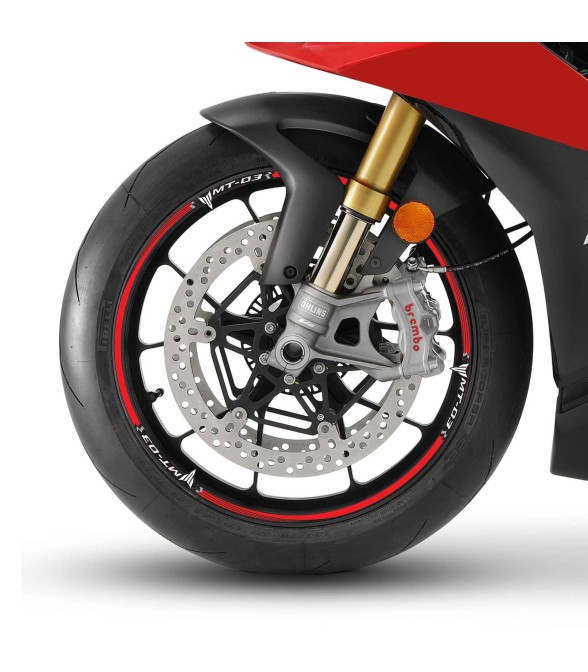 Stickers for both motorbike rims, MADE IN ITALY. Base graphics in White, Black, Green or Red with Italy tricolour flag details and lettering Mt-03.