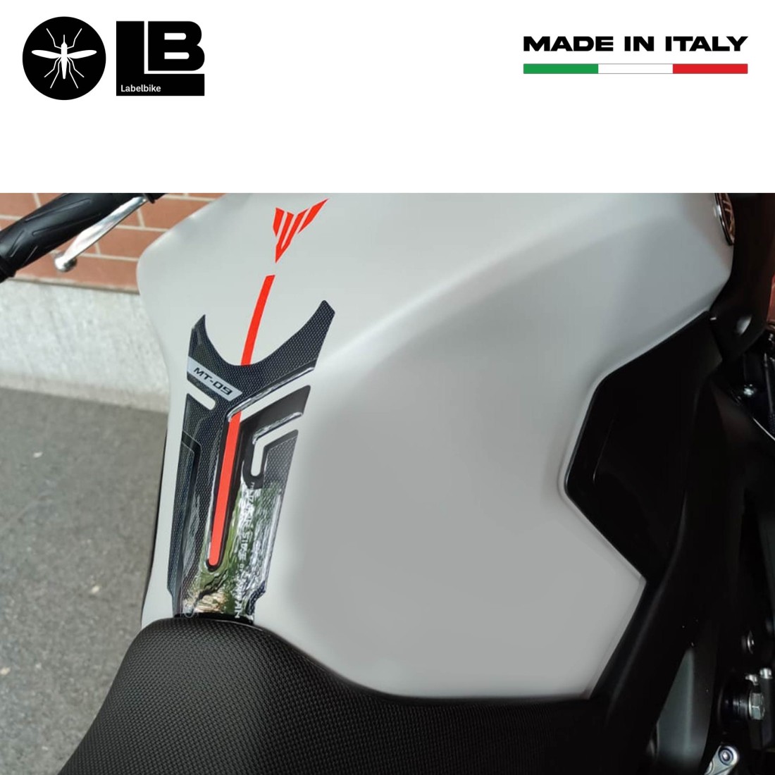 Resin adhesive tank protector for Yamaha Mt-09 Mt09 motorbikes 2017-2020 model. Exclusive Labelbike motorbike tank protector. Adhesive for tank MADE IN ITALY made in resin with 3D effect. Simil Carbon graphics with black trim and writing MT-09 and The Dark Side Of Japan. Tank protector sticker in 3D gel, universal for all motorbike colours Mt-09 2017 - 2020.