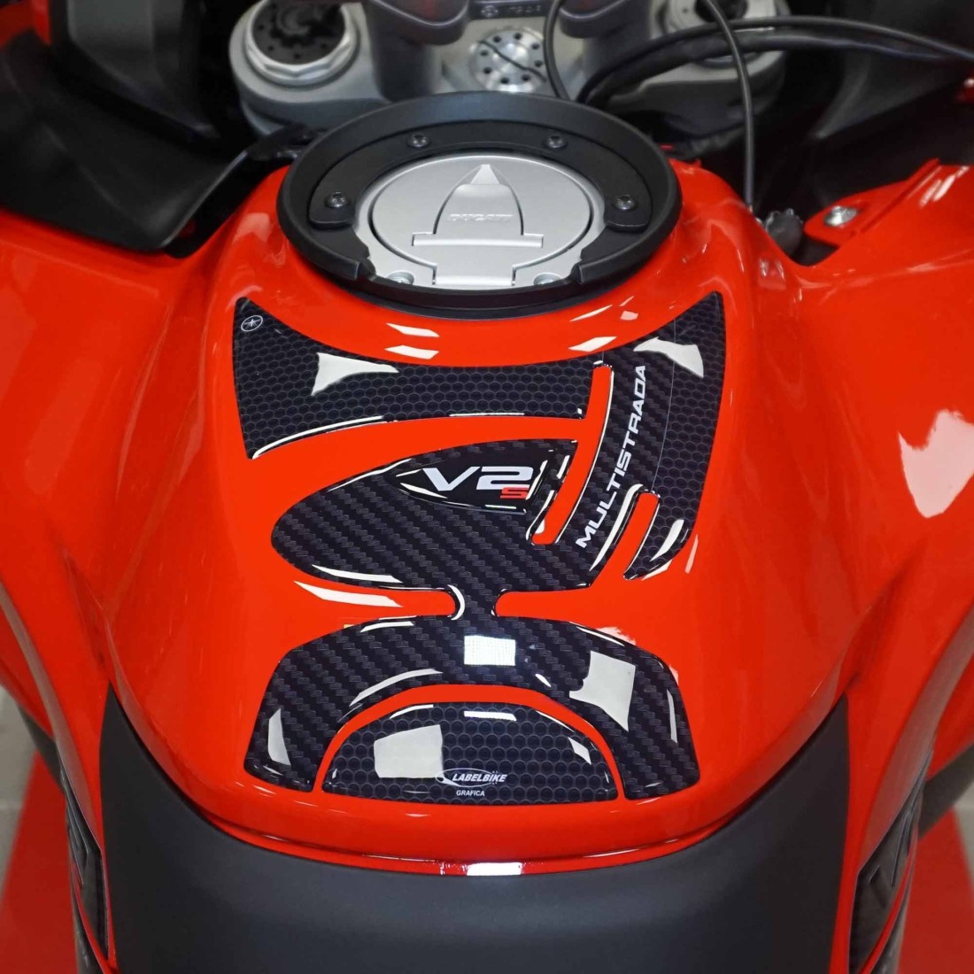 Adhesive 3D protectors compatible with Ducati Multistrada V2s 950 motorbike (2021-2022). Resin adhesive to protect and decorate the tank of your Multistrada V2s. Adhesive resin-coated motorbike graphics 3D effect, glossy surface, for motorbike tank models from 2021 .
