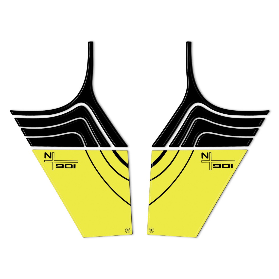 3D deflector protectors compatible with Husqvarna Norden 901 2022 motorbike side covers. Resin sticker kit to protect and decorate the tank of your Norden 901 2022. Adhesive protectors made of resin with black/yellow effect and N-901 lettering.
