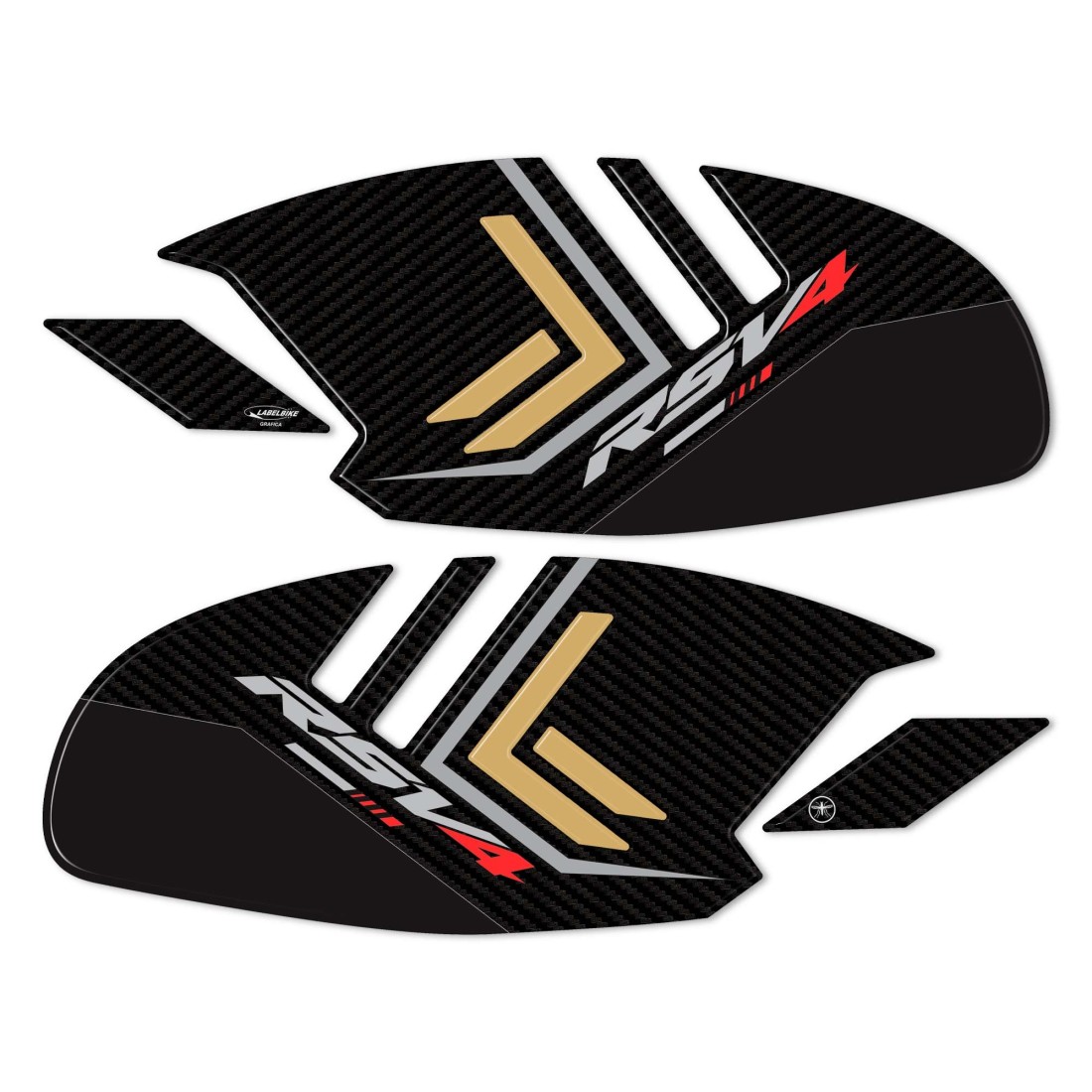 Pair of 3D resin stickers (in Carbon/Red or Carbon/Gold effect) compatible with Aprilia RSV4 1100 2021 - 2022 and RSV4 Factory 2021 - 2023 motorbike fuel tank
