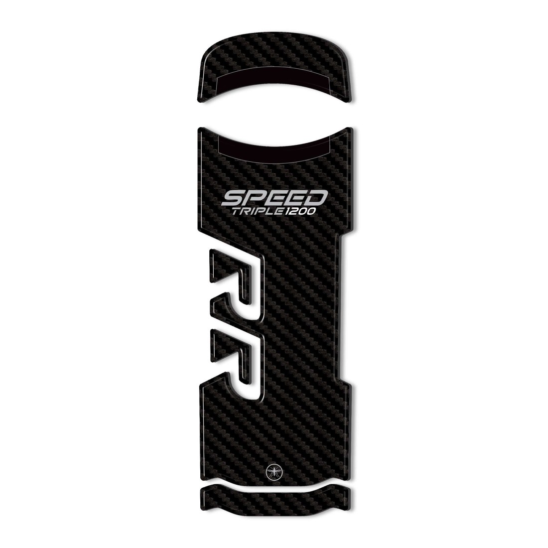 Motorbike tank protector sticker MADE IN ITALY made in metallic material with 3D effect. Graphics in Carbon Look (carbon effect) with Silver and Speed Triple 1200 RR lettering.