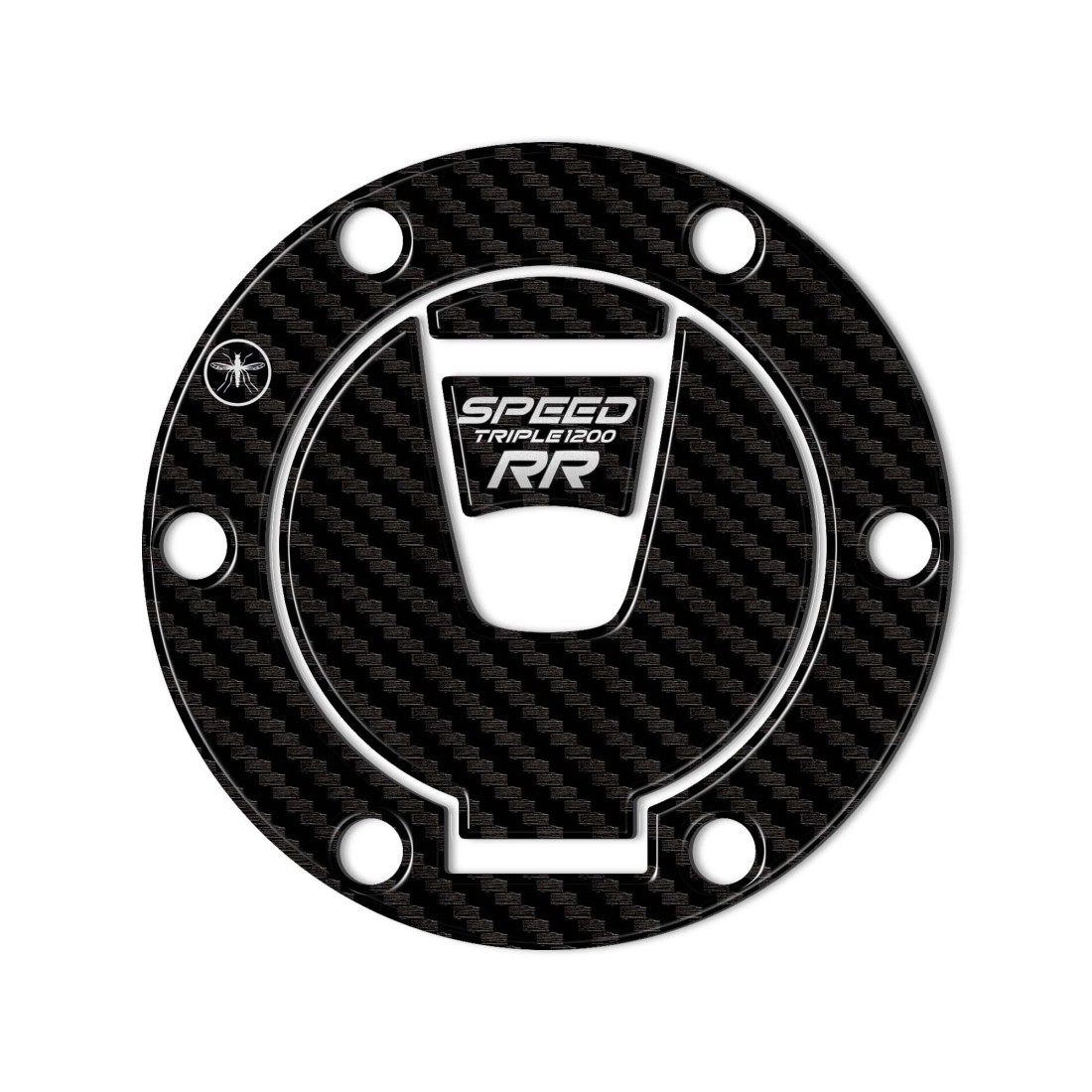 3D fuel cap protector compatible with Triumph Speed Triple 1200 RR motorbike. Resin adhesive to protect and decorate the fuel cap of your Speed Triple 1200 RR. Adhesive protection made in resin with carbon-like effect printed on metallic material and Speed Triple 1200 RR writing.