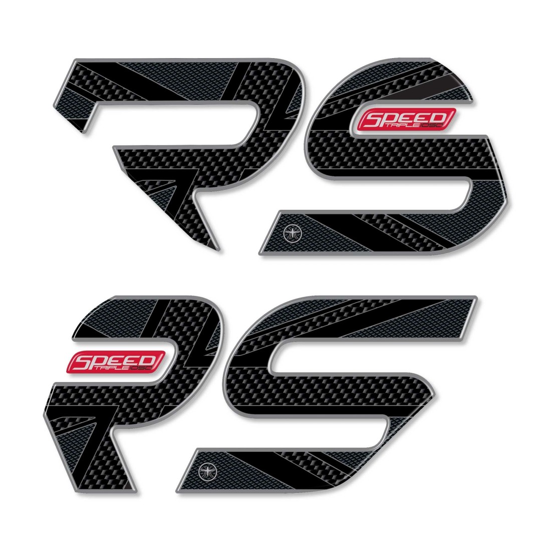 Resin adhesive protectors for Triumph Speed Triple 1050 RS motor bike side tank area. Two pairs of Triumph 3D Resin Gel Stickers Exclusive - Labelbike®. Tank side stickers MADE IN ITALY made in resin with 3D effect. Yellow or Red graphics with Carbon Look base and lettering Speed Triple 1050.
