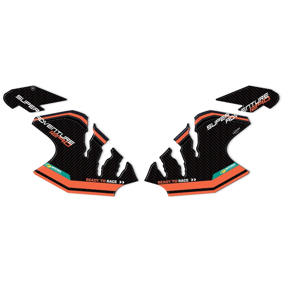 Resin stickers for Super Adventure 1290 KTM motorbike tank 2021-2024. Two stickers for motorbike tank side area, right and left side, made of 3D gel resin Exclusive - Labelbike®. Motorbike side tank stickers MADE IN ITALY made of resin with 3D effect. Universal graphics compatible with both S and R versions. 3D stickers with Carbon Look (carbon effect) and Orange base and lettering Super Adventure 1290.