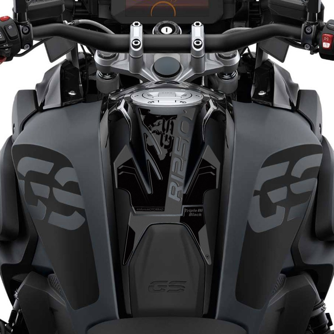 Adhesive 3D motorbike protector sticker compatible with Bmw R 1250 GS - colour Triple Black (2021-2022). Resin adhesive to protect and decorate the tank of your GS 2023. Resin adhesive graphics for motorbikes 3D effect, glossy surface, for motorbike tank in Triple Black colour.