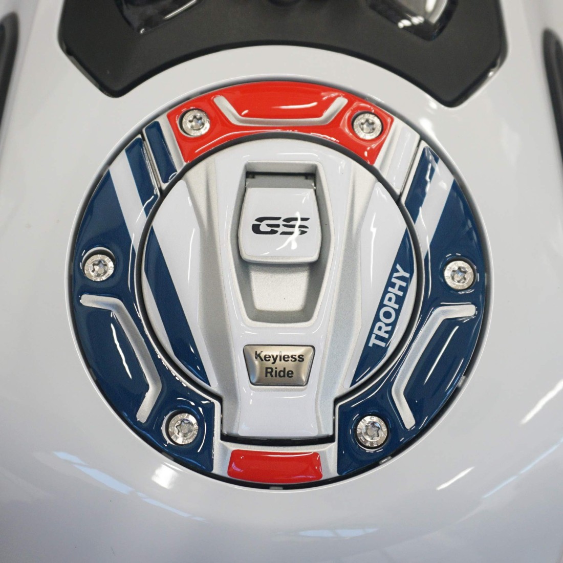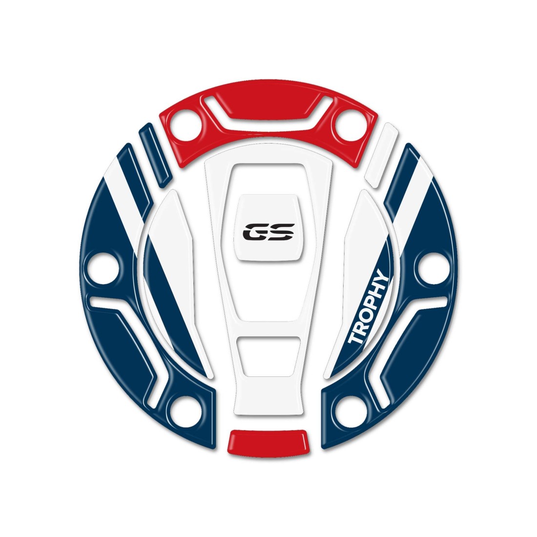 3D adhesive protection compatible with fuel cap Keyless BMW Trophy. Resin adhesive to protect and decorate the keyless fuel cap of your BMW Trophy. 3D effect sticker, glossy surface, for keyless fuel cap, made of resin with graphics dedicated to the Trophy colouring.