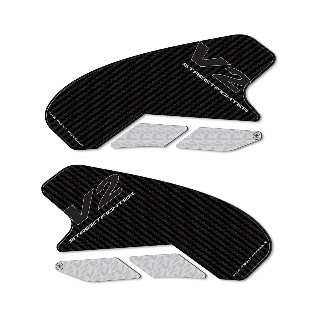 Motorbike stickers MADE IN ITALY made in metallic material with 3D effect. Graphics in Carbon Look (carbon effect) with Silver and V2 Streetfighter and The Fight Formula lettering.