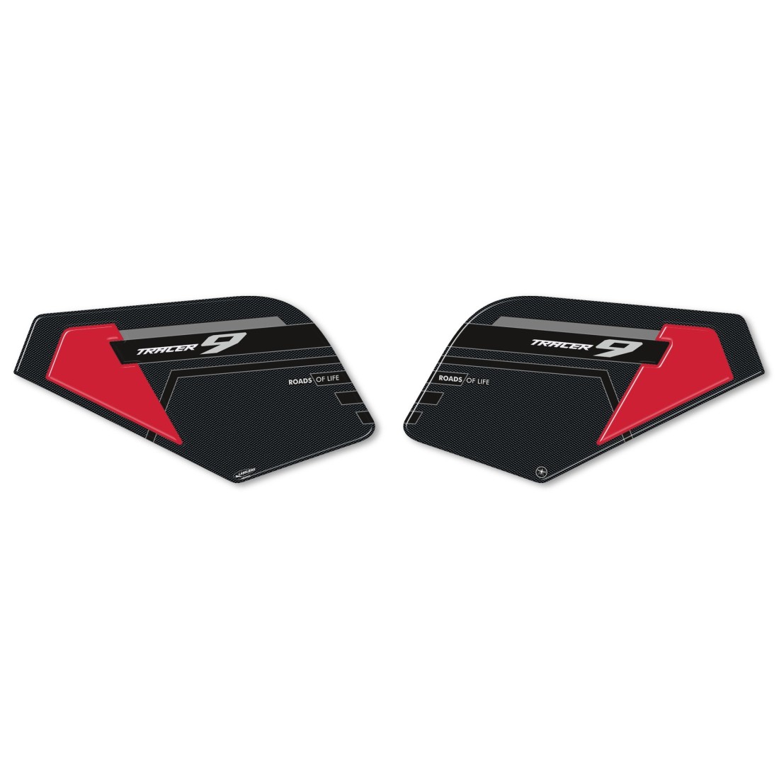 Resin adhesive protectors for side tank area Yamaha Tracer 9 from 2021. Two 3D resin gel stickers Exclusive - Labelbike. Tank side stickers MADE IN ITALY made in resin with 3D effect. Graphics in Grey, Blue or Red with Carbon Look base and lettering Tracer 9 Roads of Life.