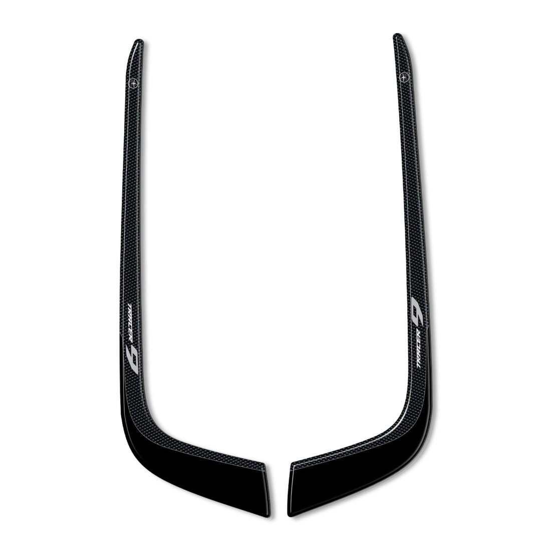 Stickers for motorbike rear handles made of resin with 3D effect. Pair for left and right side of adhesive resin protectors with Carbon Look graphics (carbon effect) and Tracer 9 lettering in grey.