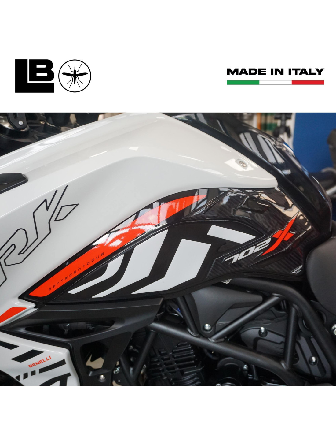 Resin adhesive protectors for Benelli TRK 702 X 2023-2025 motorbike tank. Pair of 3D gel resin stickers Exclusive - Labelbike®. Motorbike tank scratch protector stickers MADE IN ITALY.