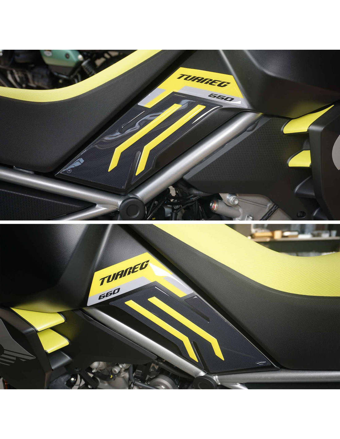 Adhesive resin protectors for side tank area motorbike Aprilia Tuareg 660 2022-25. Two 3D resin gel stickers Exclusive - Labelbike®. Tank side stickers MADE IN ITALY made in resin with 3D effect. Graphics in colour Antislip Look and Yellow or Antislip Look and Red with lettering TUAREG.