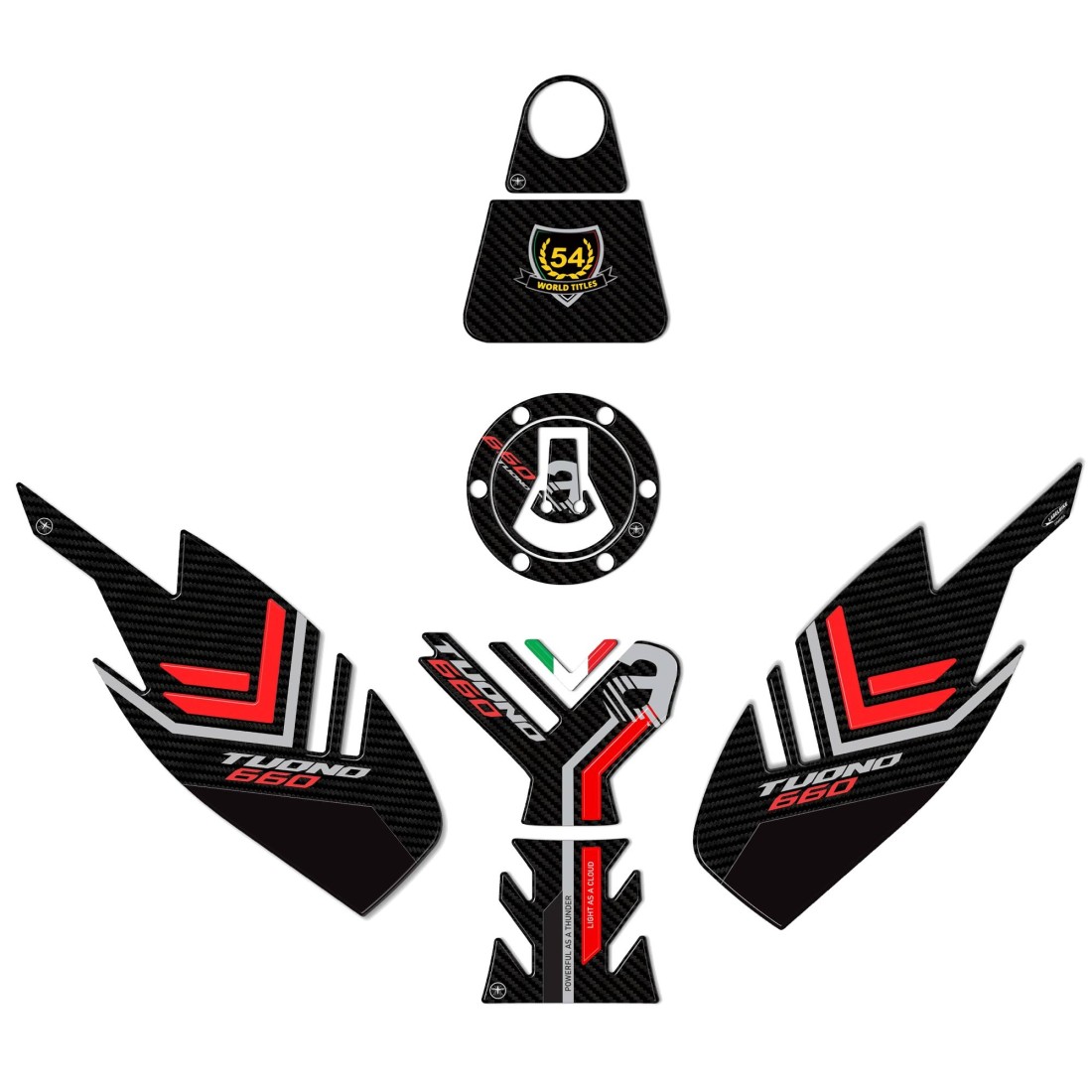 Adhesive 3D Resin protector kit, tank protector and stickers for Aprilia Tuono 660 2022. Save with the complete kit! Exclusive Labelbike, made in 3D effect resin, completely Made in Italy.
