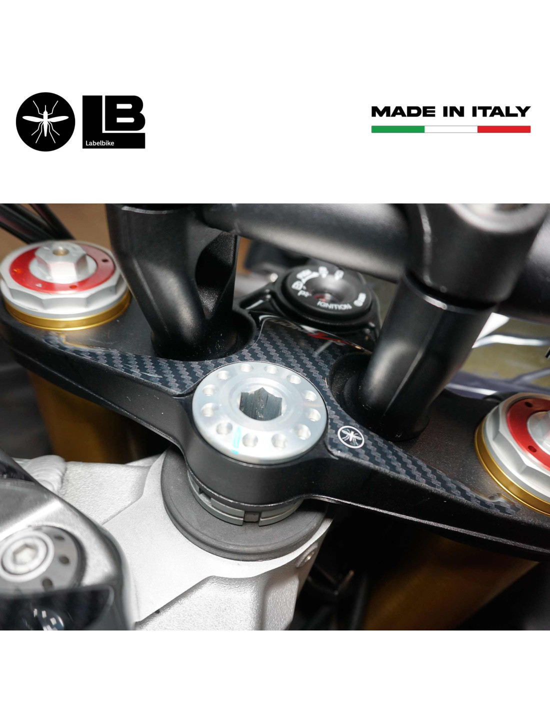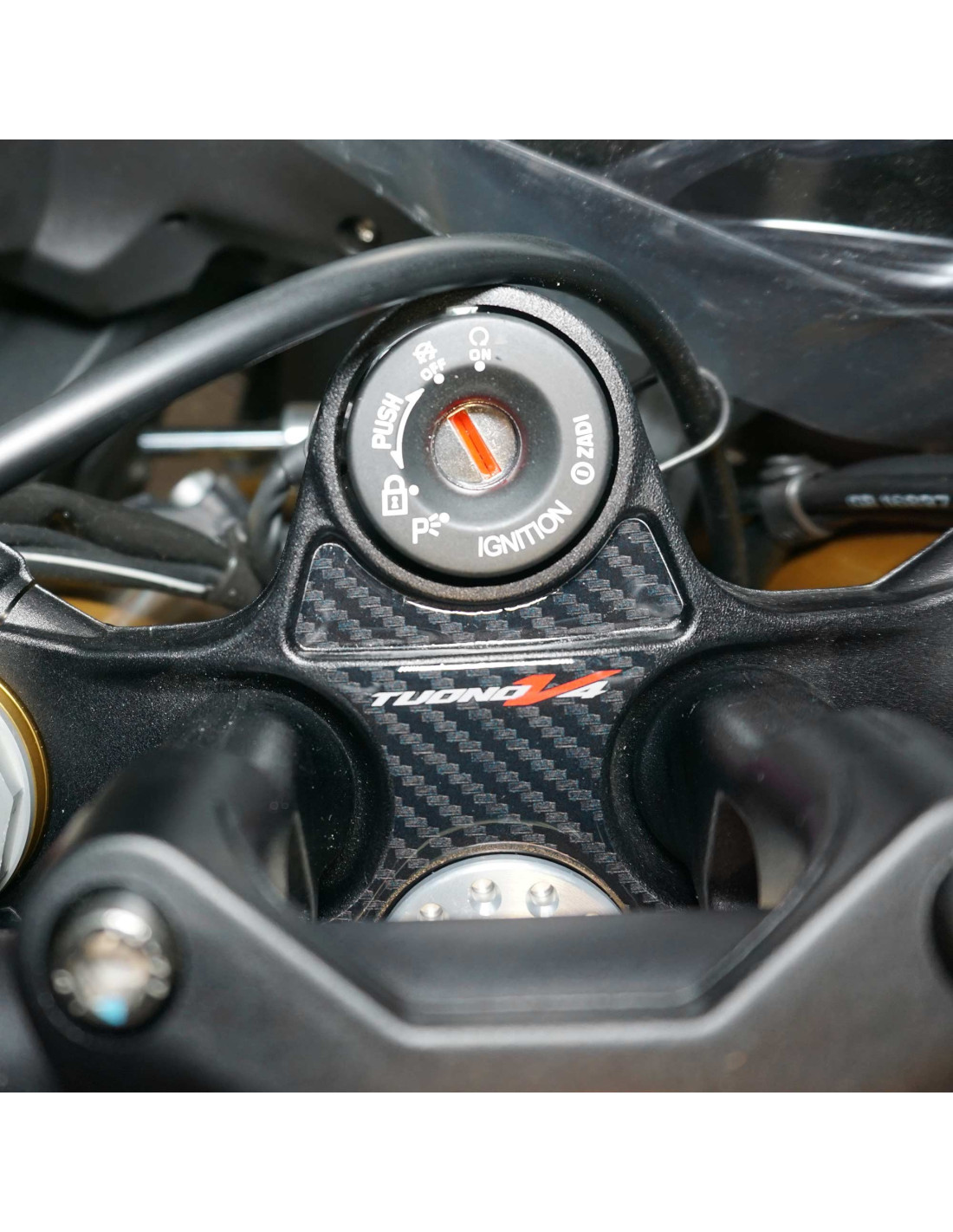 Resin coated sticker steering yoke protector compatible with Aprilia Tuono V4 1100 and Tuono 1100 V4 Factory motorbikes 2021 - 2025 Motorbike stickers for Aprilia Tuono V4 Exclusive - Labelbike.