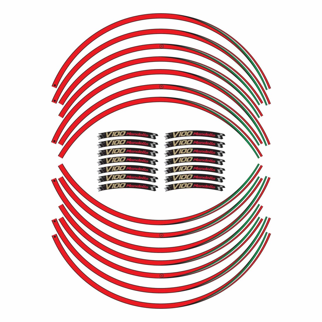Stickers for both motorbike wheels, MADE IN ITALY. Base graphics in White, Black or Red with Italy tricolour flag details and lettering Mandello V100. They decorate and enhance the aesthetics of your Moto Guzzi V100They are resistant to washing, weathering and UV rays.