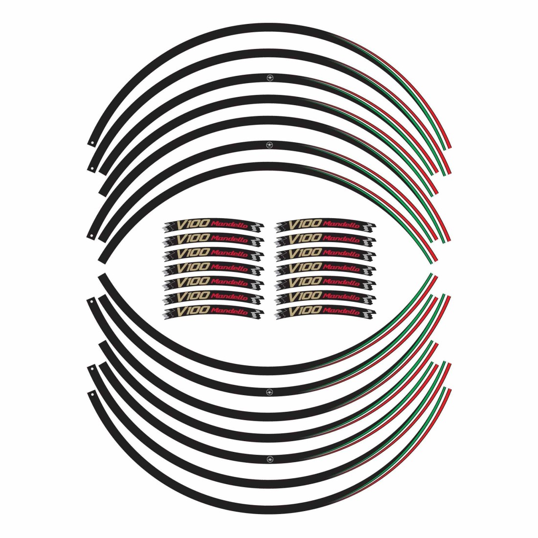 Stickers for both motorbike wheels, MADE IN ITALY. Base graphics in White, Black or Red with Italy tricolour flag details and lettering Mandello V100. They decorate and enhance the aesthetics of your Moto Guzzi V100They are resistant to washing, weathering and UV rays.