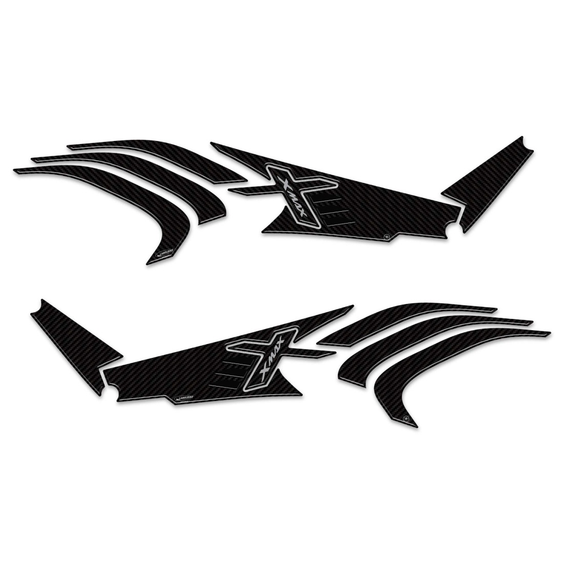 Pair for right and left side scooter sidepanels area. Adhesive protection for Xmax 2023-24 125 and 300 version side panels. Graphics with Simil Carbon base with colour variants in Blue, Black, Gold. Resin 3D effect stickers, Exclusive Labelbike, MADE IN ITALY.