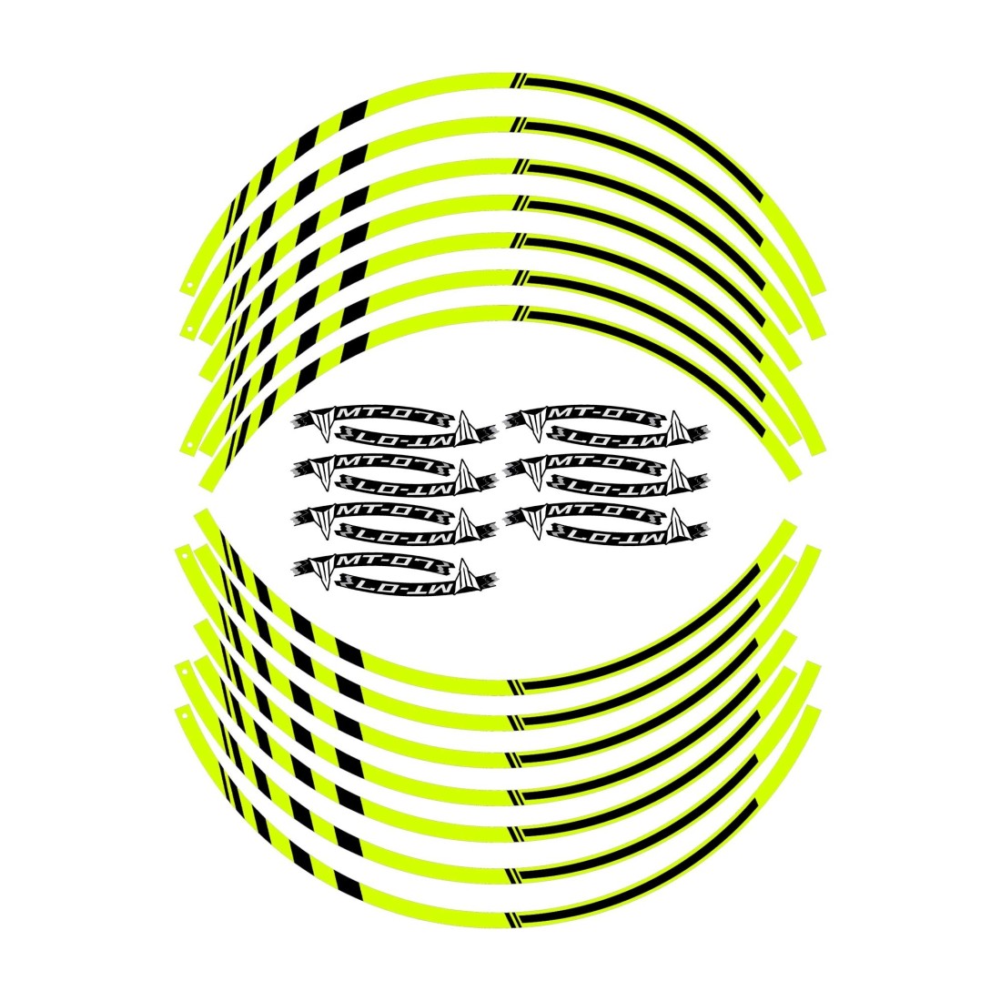 Stickers for Yamaha MT 07 motorbike wheel profile (2014 - 2022, 17 inch wheels). Adhesive stripes kit Exclusive - Labelbike®. Motorbike wheel stickers MADE IN ITALY. Fluorescent yellow graphics and lettering Mt-07. Decorate and enhance the look of your Yamaha MT07, resistant to washing, weathering and UV rays.