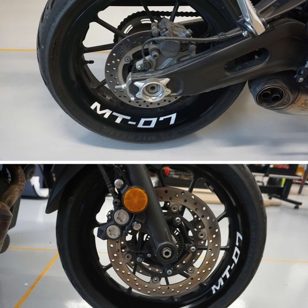 Stickers for inside rim area motorbike rims Yamaha MT 07 (2014 - 2022, 17 inch wheels). Kit of adhesive strips inscription Mt-07 Exclusive - Labelbike®. Stickers for motorbike wheels MADE IN ITALY. Inscription graphics Mt-07 in three different colours: Fluorescent yellow; Black; White. They decorate and enhance the look of your Yamaha MT07, resistant to washing, weathering and UV rays.