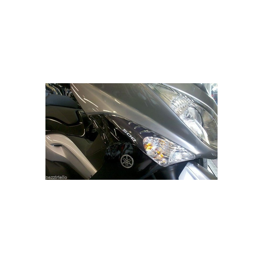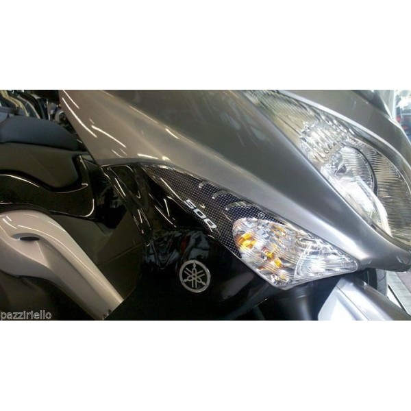 Coppia di Adesivi per Zona Frecce Yamaha Tmax 2008-2011. Realizzati in resina gel 3D con grafica in carbon look (simil carbonio) e scritta bianca.