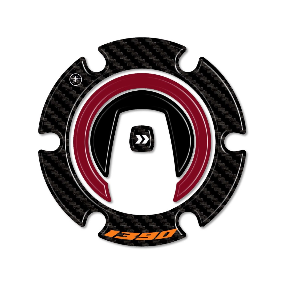 Protezione adesiva 3D compatibile con tappo benzina KTM 1390 Super Duke R 2024. Adesivo resinato per proteggere e decorare il tappo serbatoio della tua KTM 1390 Super Duke R. Adesivo effetto 3D, superficie lucida, per tappo serbatoio 2024, realizzati in resina con base Carbon Look (simil carbonio) e finiture in Arancione o Rosso con scritta 1390.
