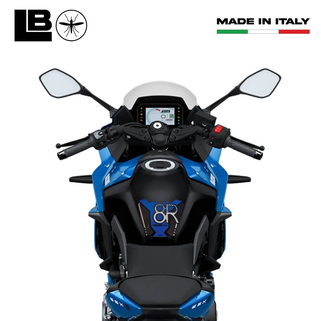 Protezione adesiva resinata per proteggere e decorare il serbatoio della tua moto Suzuki GSX-8R dal 2024. Adesivo in resina gel 3D Esclusivo - Labelbike®. Adesivo per serbatoio MADE IN ITALY realizzato in resina con effetto 3D. Paraserbatoio moto con grafiche in 3 colorazioni: blu, grigio, rosso grigio con Carbon Look e disegno 8R intagliato nella grafica.