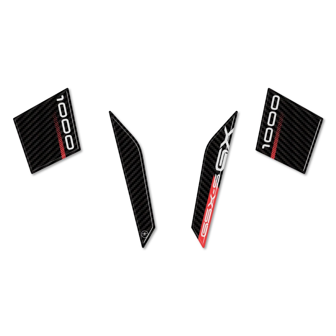 Adesivo per Frontale moto realizzatio in resina con effetto 3D. Protezione adesiva resinata con grafica in tre diverse colorazioni: Argento e Giallo; Carbonio e Rosso; Argento e Rosso per GSX-S1000GX.
