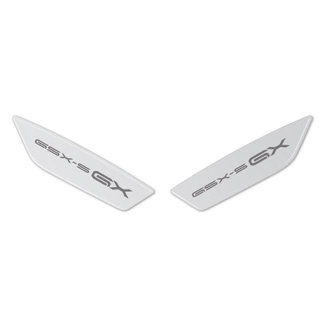 Adesivi per specchietti moto realizzati in resina con effetto 3D. Coppia per lato destro e sinistro di protezioni adesive resinate con grafica in argento e scritta GSX-S GX.