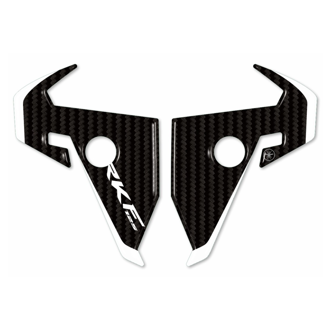 Protezioni adesive resinate per zona cupolino frontale moto Keeway RKF 125 2018 - 2025. Adesivi in resina gel 3D Esclusivi - Labelbike®. Adesivi anteriori per cupolino MADE IN ITALY realizzati in resina con effetto 3D. Grafiche in colorazione Carbon Look (effetto carbonio) e bianco con scritte RKF 125.