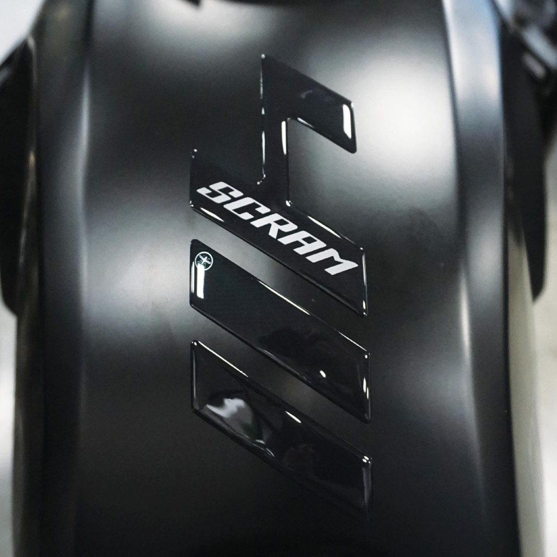 Protezione serbatoio Moto realizzato in resina gel 3D su materiale metallizzato. Paraserbatoio moto con grafica base nera e scritta SCRAM effetto argento metallizzato.