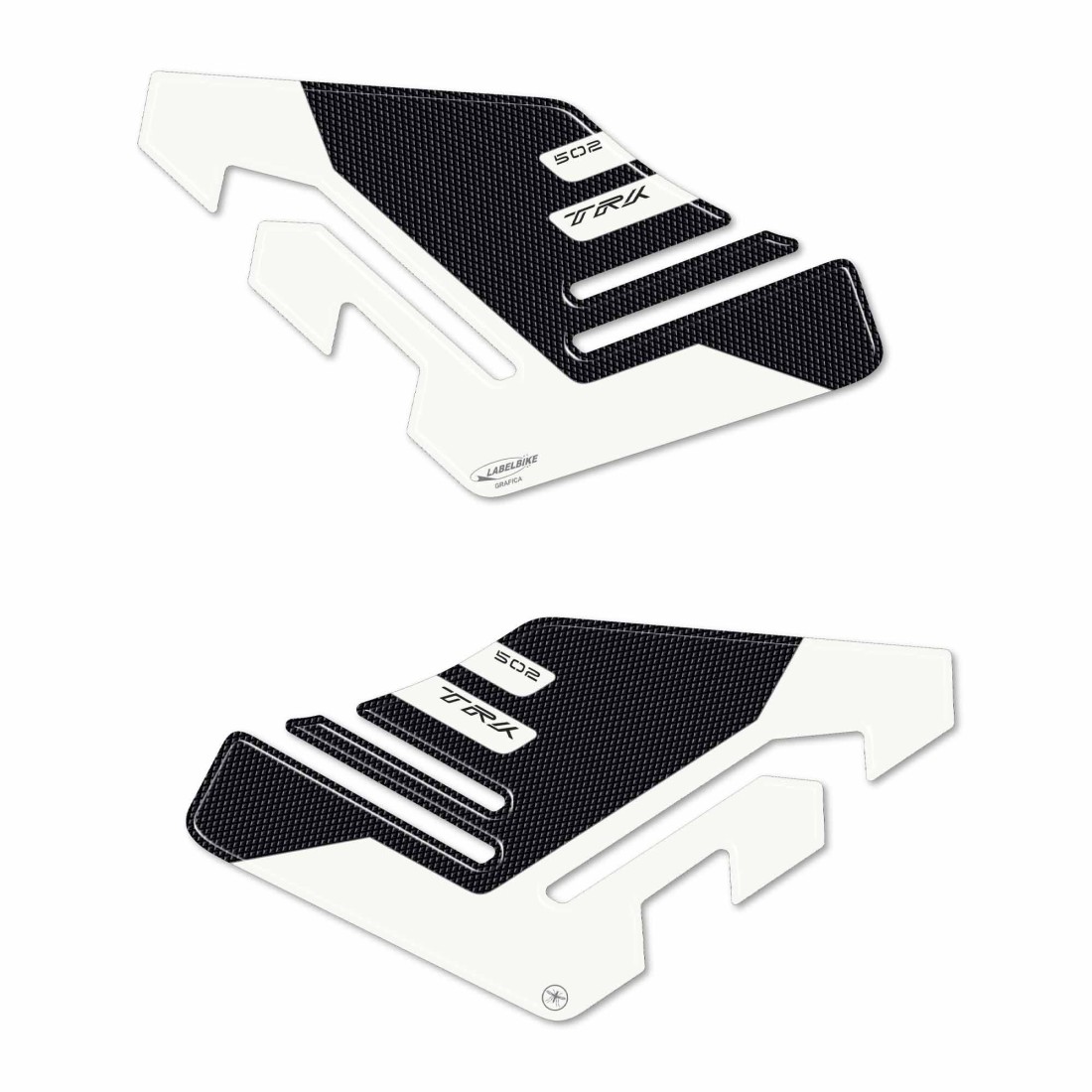 Protezioni laterali per serbatoio moto Benelli TRK 502 dal 2021 al 2025. Coppia di Adesivi in resina gel 3D per lato destro e sinistro serbatoio, Esclusivi - Labelbike®. Adesivi per colorazione bianca della moto, proteggono da graffi il serbatoio. Protezioni adesive resinate MADE IN ITALY.