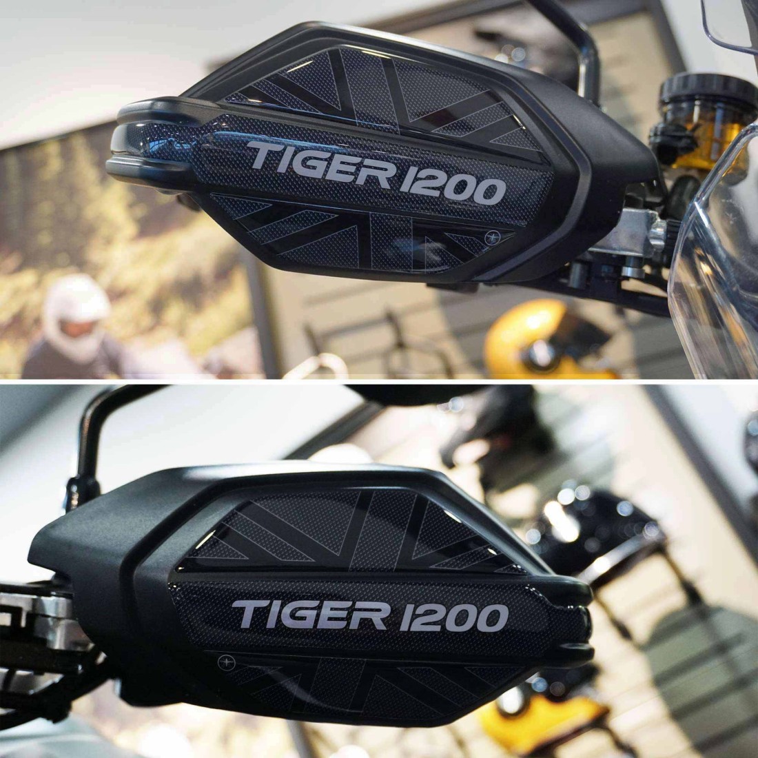 Protezioni 3D per paramani compatibili con moto Triumph Tiger 1200 GT, GT Pro, Rally Pro dal 2022. Kit di adesivi resinati per proteggere e decorare i paramani della tua Tiger 1200 2022. Protezioni adesive realizzate in resina con effetto simil carbonio e scritta Tiger 1200 For the ride.