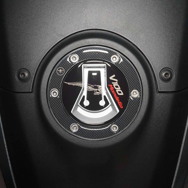 Protezione adesiva resinata per Moto Guzzi V 100 2022 - 2023. Adesivo protezione 3D tappo carburante moto. Adesivo in resina gel 3D Esclusivo - Labelbike® MADE IN ITALY con grafica universale e compatibile con tutte le colorazioni della V 100 e versione S. Adesivo resinato 3D con base in Carbon Look (effetto carbonio) e nero con scritta Mandello V100.