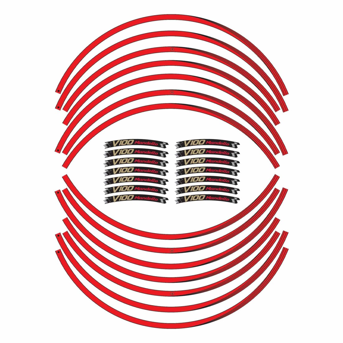 Adesivi per entrambi i cerchi moto, MADE IN ITALY. Grafiche con base in colorazione Bianco, Nero o Rosso con dettagli bandiera tricolore Italia e scritte Mandello V100. Decorano e migliorano l'estetica della tua Moto Guzzi V100, resistono a lavaggi, intemperie ed ai Raggi U.V.
