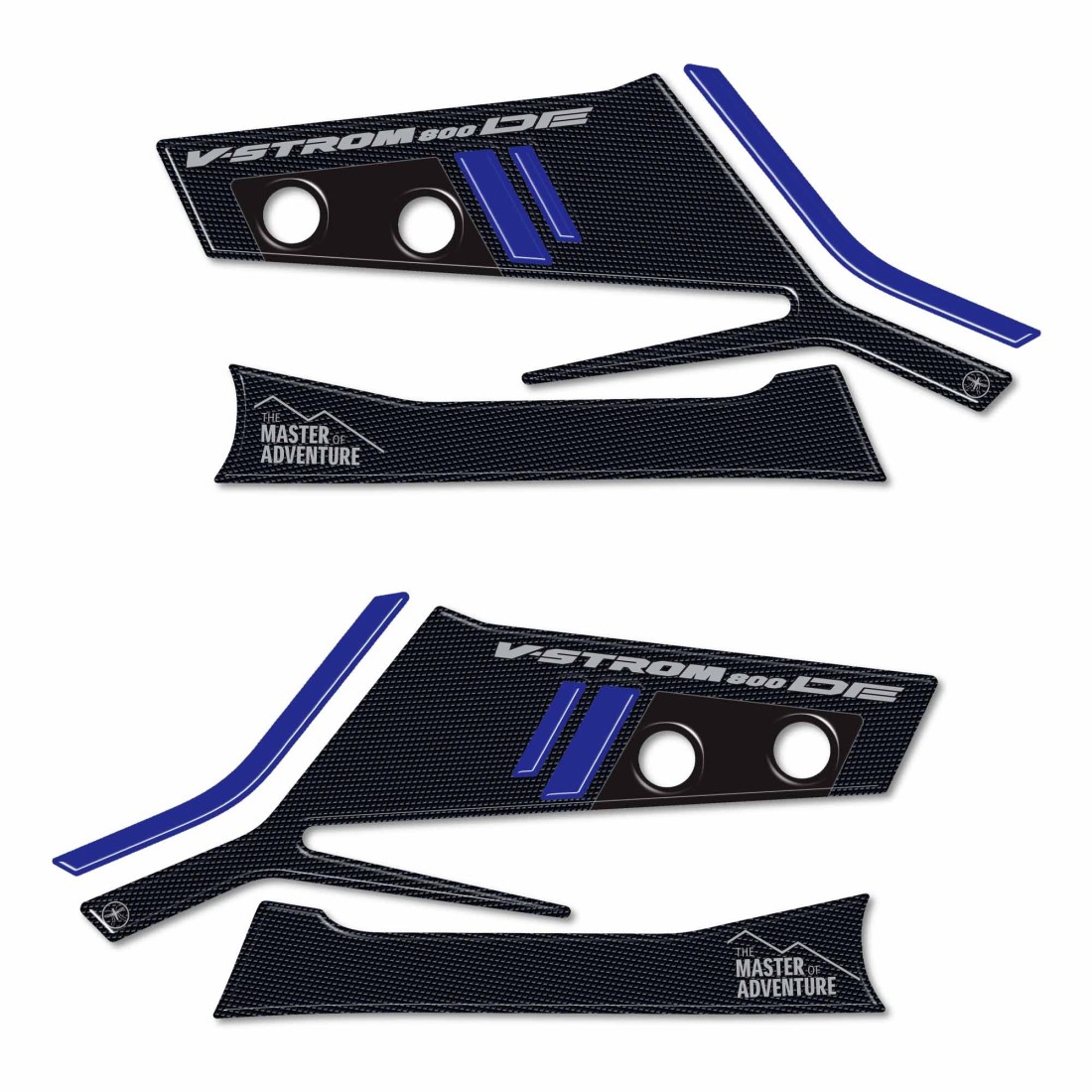 Adesivi per paramani moto realizzati in resina con effetto 3D. Coppia per lato destro e sinistro di protezioni adesive resinate con grafica in Giallo o in Blu e scritta V-Strom 800DE.