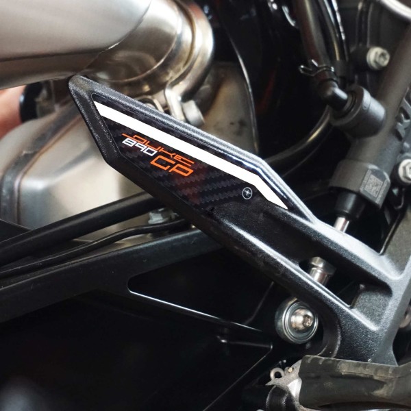 Protezioni adesive 3D compatibili con zona pedane poggiapiedi moto KTM Duke 890 GP. Adesivi resinati per proteggere e decorare il battitacco della tua 890 Duke GP. Protezioni adesive con effetto 3D, superficie lucida, per lato destro e sinistro moto 2022-2023 KTM Duke 890 GP.