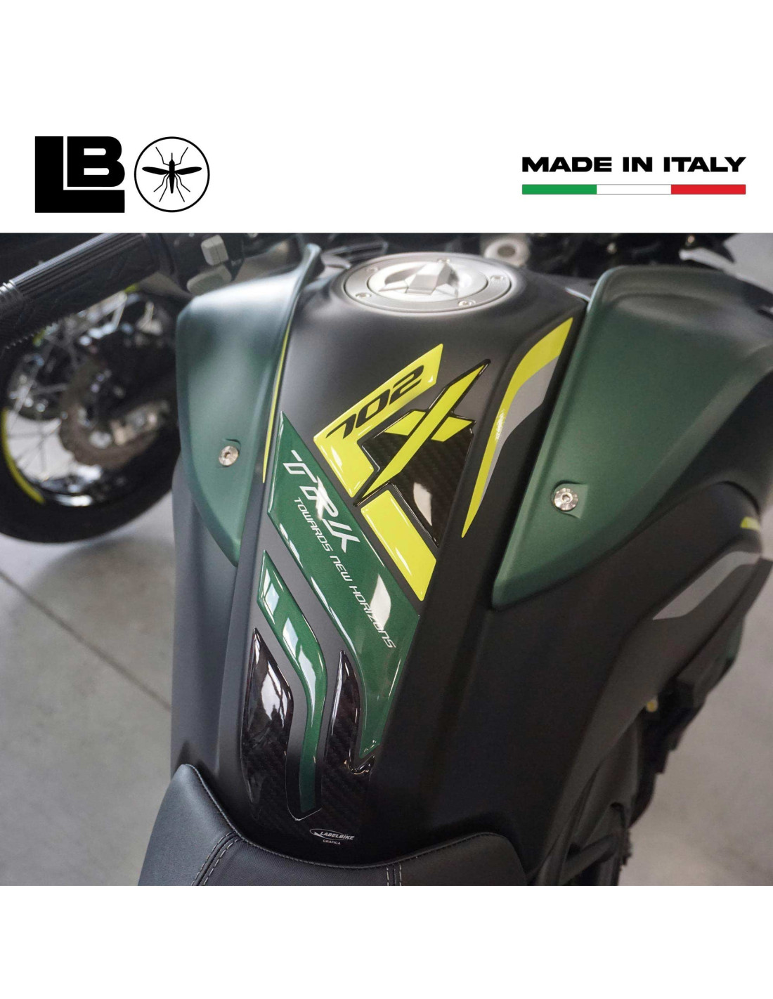 Paraserbatoio adesivo moto realizzato in resina con effetto 3D. Adesivo protettivo resinato Esclusivo - Labelbike, MADE IN ITALY. Adesivo Protezione resinata compatibile con serbatoio moto Benelli TRK 702 X.