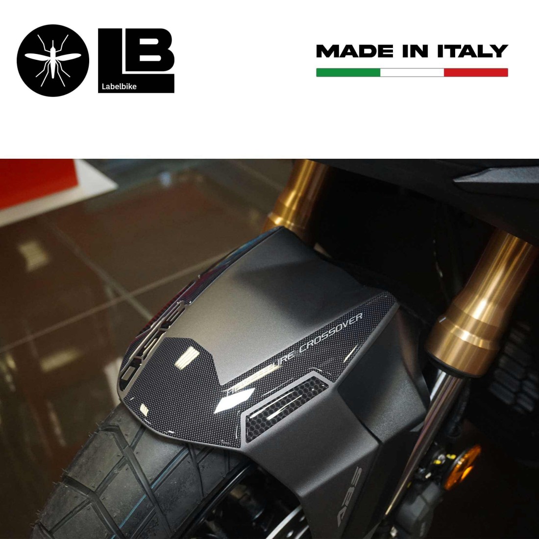 Protezioni adesive 3D compatibili con Maxi Scooter Honda Adv 350. Adesivo resinato per proteggere e decorare il parafango anteriore del tuo Adv 350 2022-25. Adesivi per Adv350 2022-23, effetto 3D, superficie lucida, per zona parafango. Realizzati in resina con base Carbon Look (simil carbonio) e finiture Simil Antiscivolo e scritta Adventure Crossover.