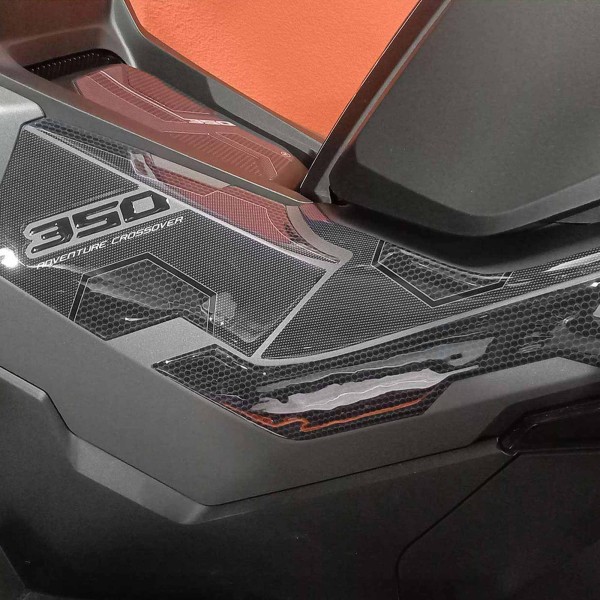 Protezioni adesive resinate per zona sottosella boomerang Honda ADV350 2022-25. Esclusivi - Labelbike®. Adesivi lato Sx e Dx zona laterale pedane ADV 350 MADE IN ITALY realizzati in resina con effetto 3D. Grafica in Simil Carbonio e Nero con scritte 350 Adventure Crossover. Adesivi Resinati Protezione 3D compatibili con modello Honda ADV350 dal 2022 al 2023.