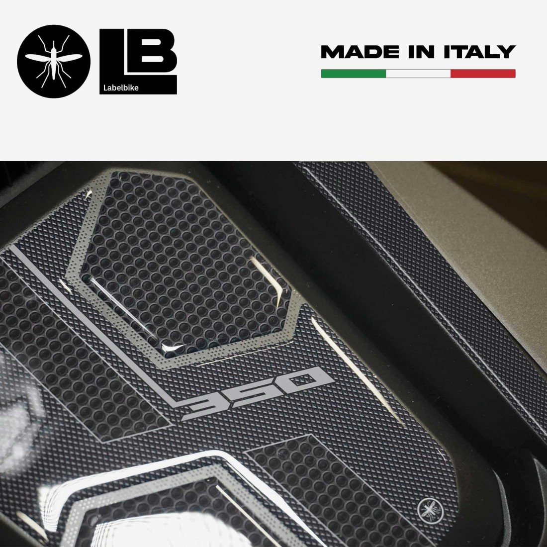 Protezioni resinate adesive per zona centrale pedana e sportello. Grafica con base in Simil Antiscivolo e Carbonio e scritta 350. Adesivi resinati effetto 3D, Esclusivi Labelbike® MADE IN ITALY.