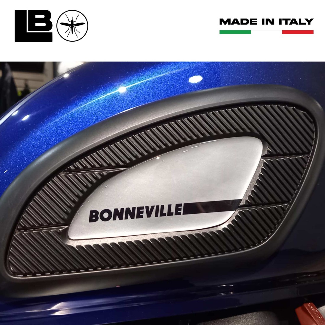 Adesivi di protezione per serbatoio moto realizzati in resina con effetto 3D. Protezioni adesive resinate con grafica in argento e scritta Bonneville.