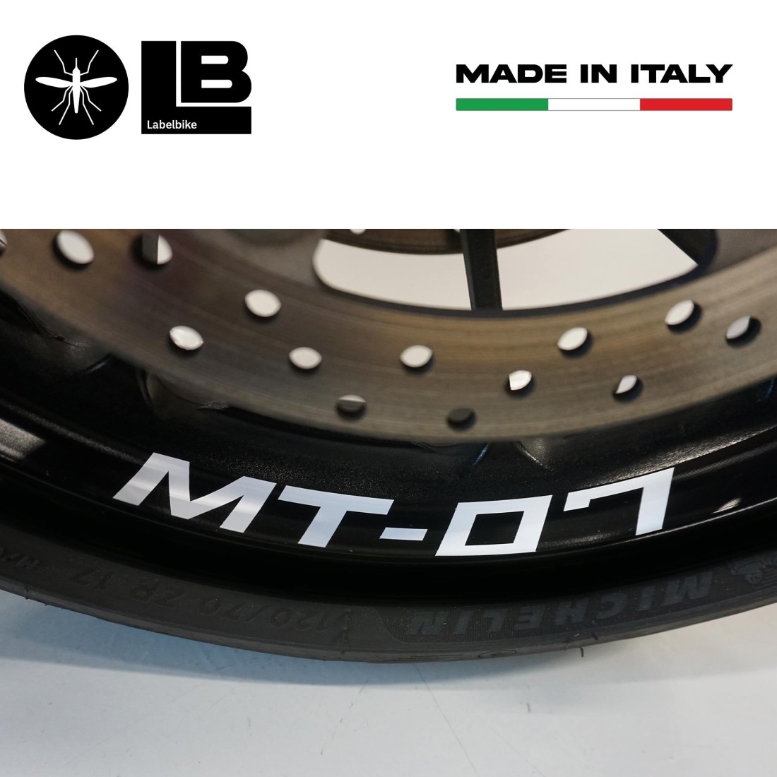 Adesivi per zona interna cerchi moto Yamaha MT 07 (2014 - 2022, ruote 17 pollici). Kit di strisce adesive scritta Mt-07 Esclusivi - Labelbike®. Adesivi per ruote moto MADE IN ITALY. Grafiche scritte Mt-07 in tre diverse colorazioni: giallo fluorescente; Nero; Bianco. Decorano e migliorano l'estetica della tua MT07 Yamaha, resistono a lavaggi, intemperie ed ai Raggi U.V.