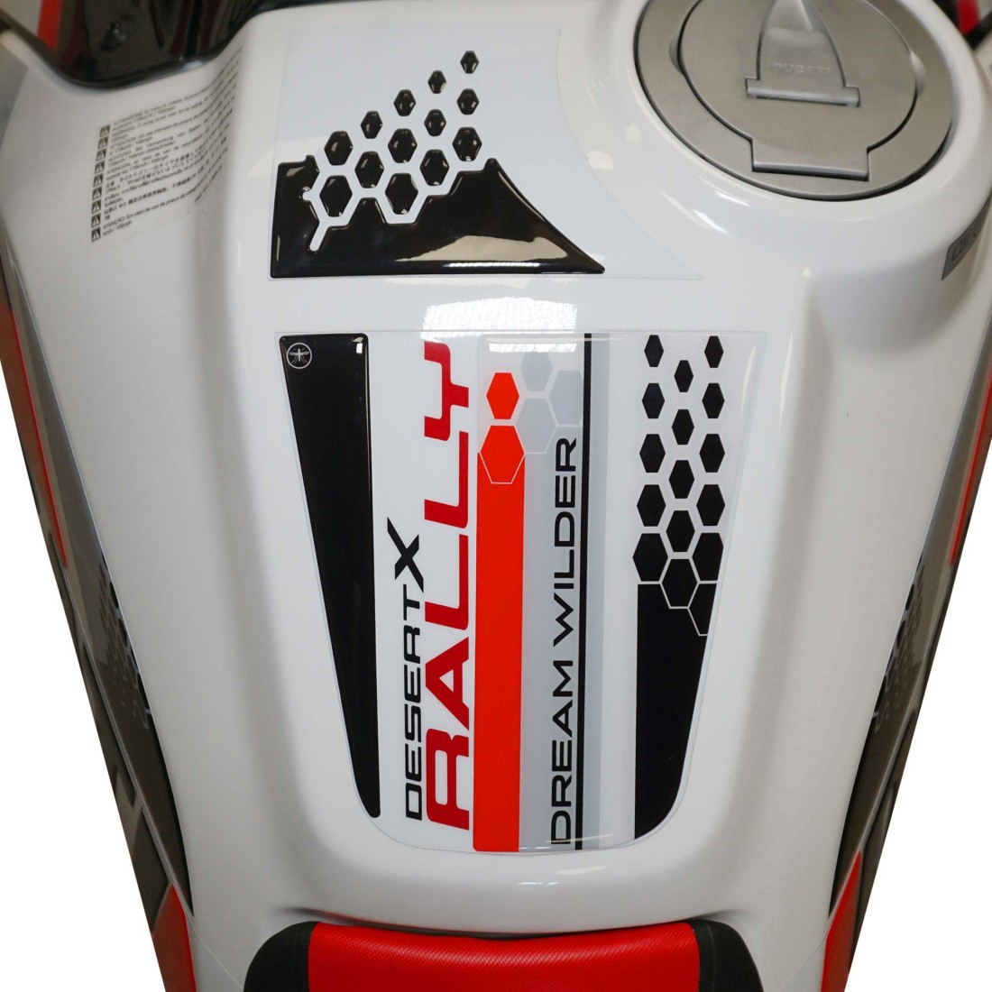 Adesivi moto paraserbatoio realizzati in resina con effetto 3D. Protezioni adesive resinate con grafica dedicata alla colorazione Iron Giant Livery Ducati DesertX Rally 2024-2025