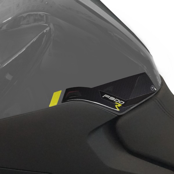 Adesivi laterali per Serbatoio moto realizzati in resina con effetto 3D. Coppia per lato destro e sinistro di protezioni adesive resinate con grafica con base antiscivolo e dettaglio in giallo e scritta F900 R.