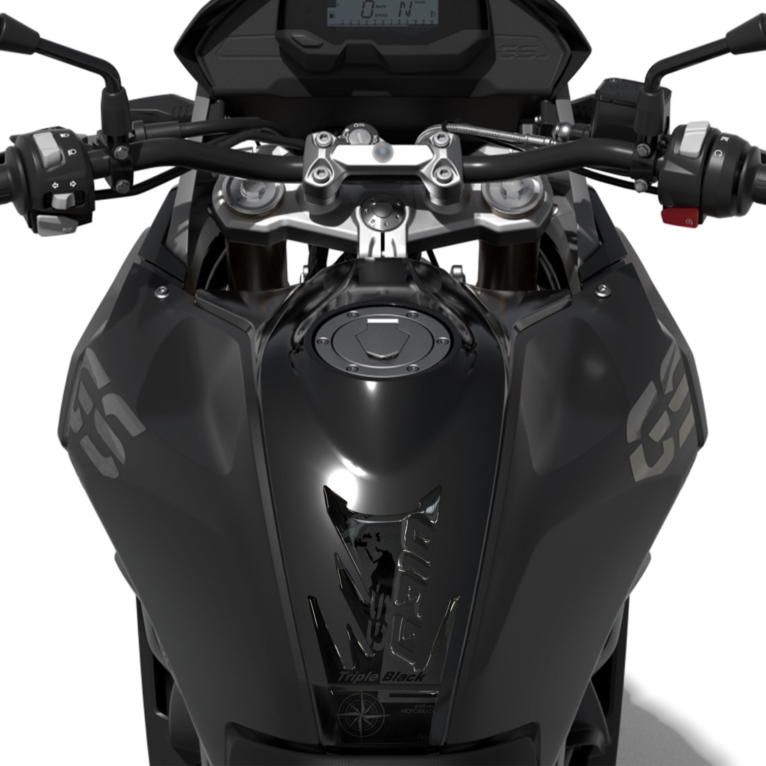 Protezioni adesive 3D compatibili con moto BMW GS 310 dal 2017 colorazione Triple Black. Adesivo resinato per proteggere e decorare il serbatoio della tua G310 GS dal 2017. Grafiche adesive per moto resinate effetto 3D, superficie lucida, per serbatoio moto modelli Triple Black GS 310 dal 2017.