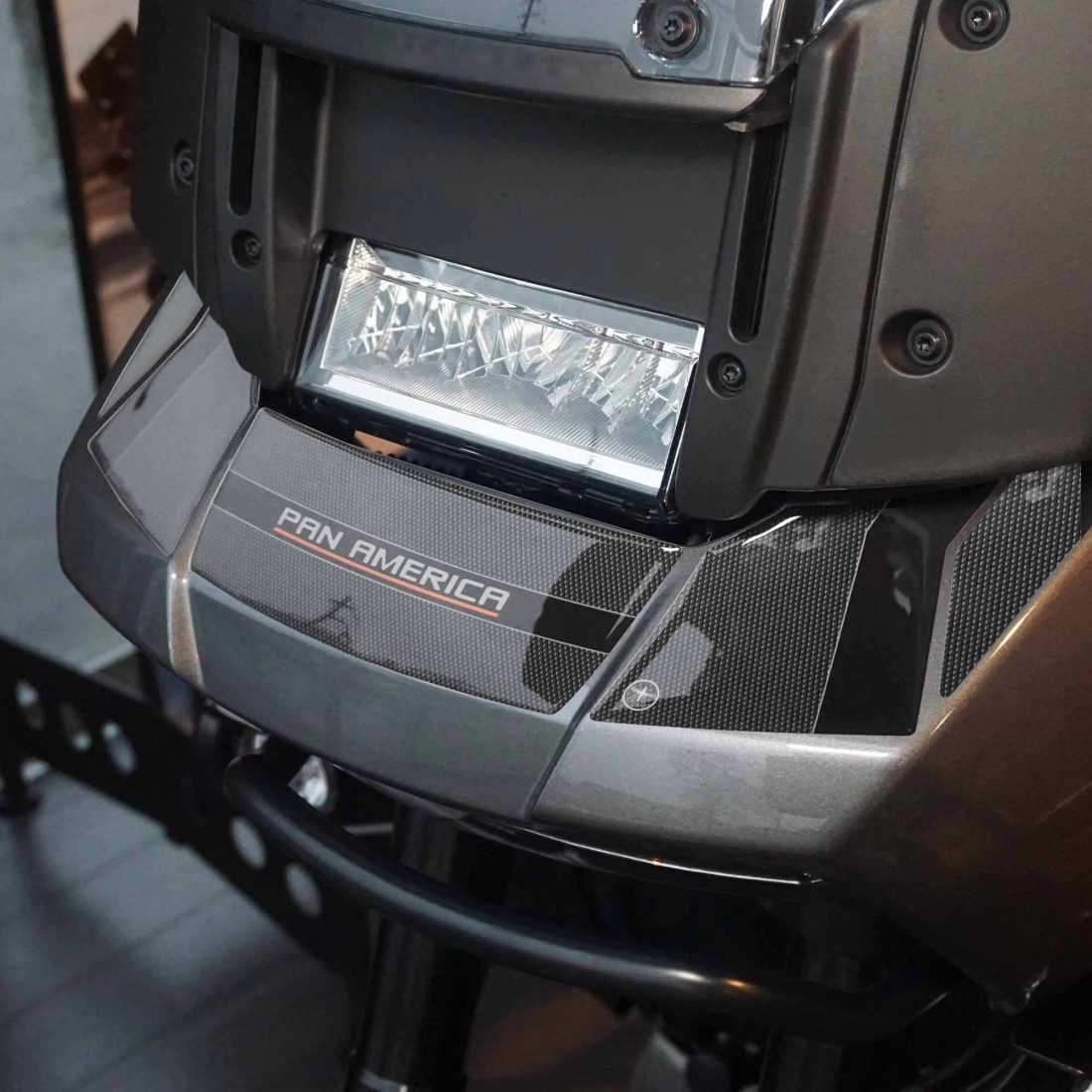 Adesivi frontale moto realizzati in resina con effetto 3D. Protezioni adesive resinate con grafica in nero ed antiscivolo, scritta Pan America e dettagli dedicati alla colorazione della moto.