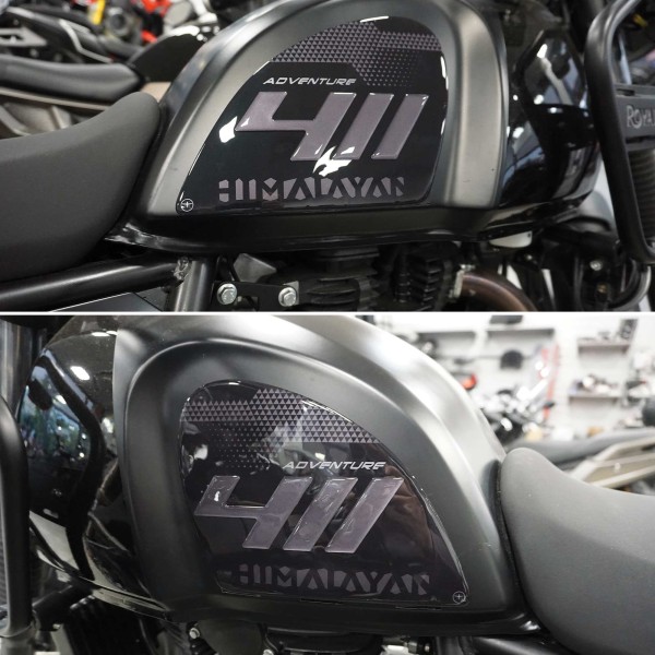 Protezioni resinate per serbatoio Moto con effetto 3D realizzate su materiale metallizzato. Adesivi laterali per lato destro e sinistro serbatoio moto con grafica base nera ed effetto doppio 3D per il numero "411". Scritta Adventure effetto argento metallizzato all'interno degli adesivi.
