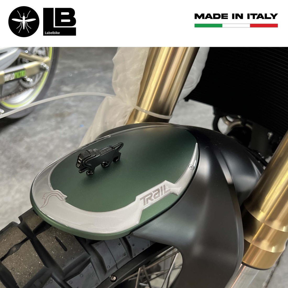 Protezione adesiva resinata per zona frontale moto Benelli Leoncino 800 Trail 2022-2025. Adesivo in resina gel 3D effetto metallizzato Esclusivo - Labelbike®. Adesivo proteggi graffi parafango moto MADE IN ITALY realizzato in resina con effetto 3D. Grafica in argento e scritta 800 Trail.