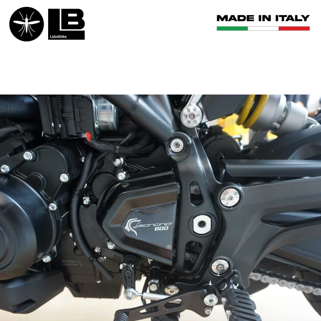Protezione adesiva resinata per carter moto Benelli Leoncino 800 e 800 Trail 2022-2025. Adesivo in resina gel 3D effetto metallizzato Esclusivo - Labelbike®. Adesivo proteggi graffi per moto MADE IN ITALY realizzato in resina con effetto 3D. Grafica con base Carbon Look (effetto carbonio) e scritta Leoncino 800 in argento.